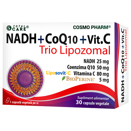 6789 leiPreț unitar /IndisponibilNADH + CoQ10 + Vitamina C Trio Lipozomal, 30 capsule vegetale, Cosmopharm