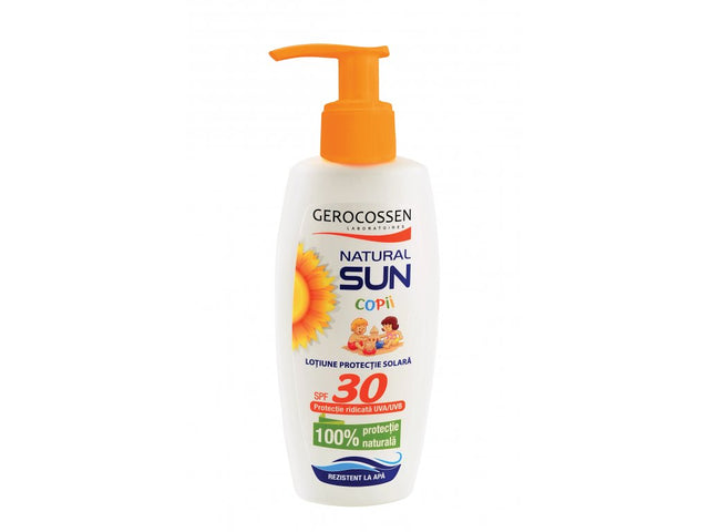 Lotiunea de soare pentru copii cu SPF 30 ofera protectie ridicata impotriva radiatiilor UVB si UVA. Este formulata cu ingrediente naturale, inclusiv ulei de karanja, ulei de morcov si ulei de masline, pentru a proteja pielea sensibila a copiilor. Usor de aplicat si rezistenta la apa, aceasta lotiune este ideala pentru zilele petrecute la soare. Se recomanda aplicarea abundenta inainte de expunerea la soare si reaplicarea frecventa.