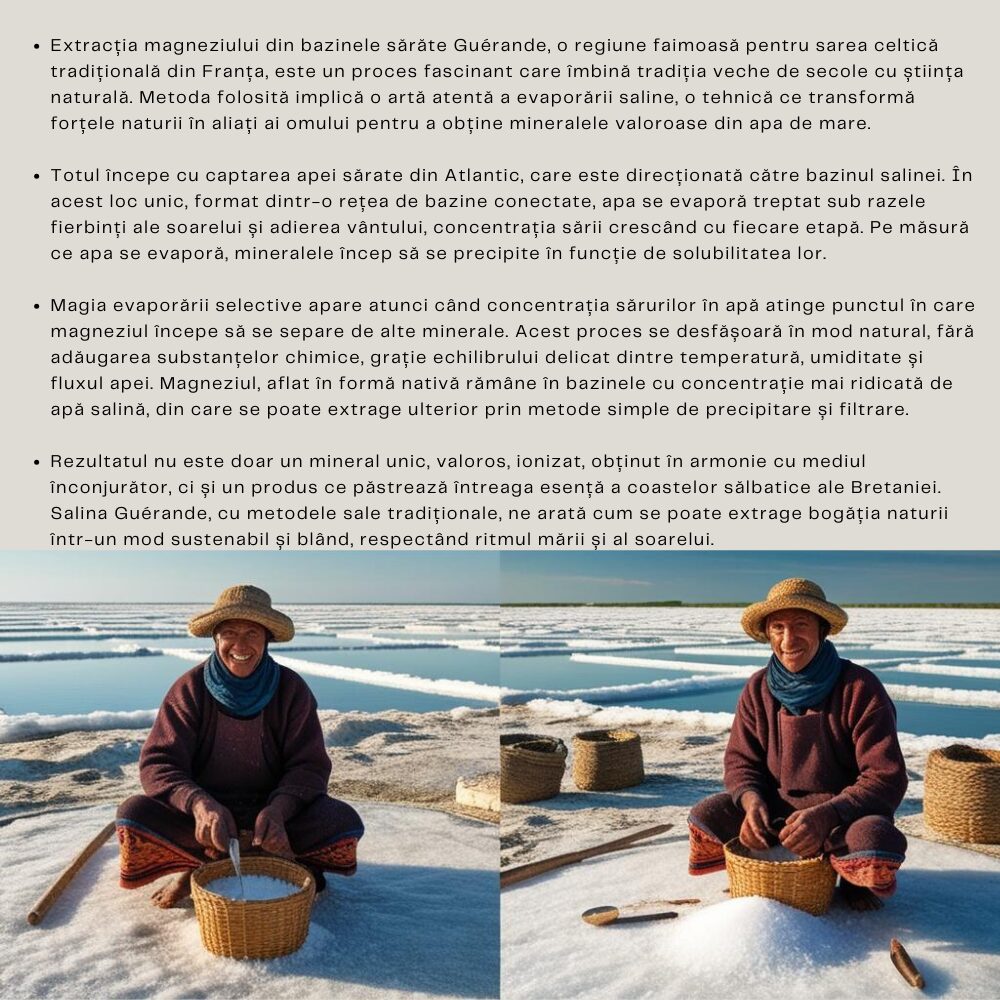 AlgoSource, are peste 30 de ani de expertiză în selecția, extracția și formularea ingredientelor bioactive, reușește să reducă nivelul de sodiu al magneziului marin, din mlaștinile sărate din Guerande - Franța. Recoltarea sării utilizate se face manual, cu ajutorul culegătorilor tradiționali de sare, din sit Natura 2000. Apa de mare reziduală, din iazurile cu evaporare salină („ape mame”) este sursă extraordinară de minerale și oligoelemente, inclusiv magneziu, calciu, fosfor, sodiu și potasiu, o formulă unică, lichidă ionizată (MG2+) perfect biodisponibilă și bioasimilabilă, pe care doar natura știe să o producă!