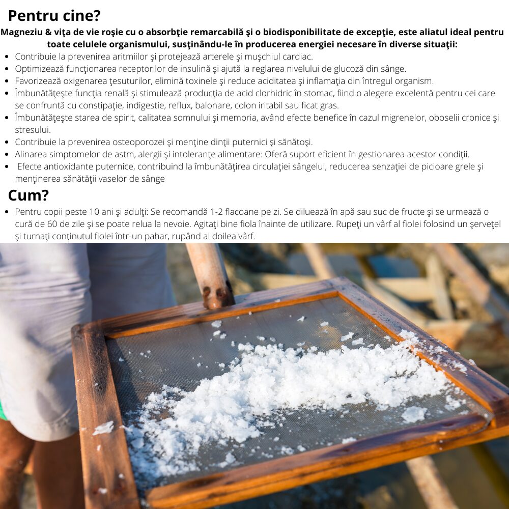 Magneziu cum doar natura știe să producă! Prin intermediul unui bio-proces unic în lume, fără tratament termic și fără solvenți chimici reușește să reducă nivelul de sodiu al magneziului marin, din mlaștinile sărate din Guerande - avănd ca rezultat final, o formulă unică, lichidă ionizată (MG2+) perfect biodisponibilă și bioasimilabilă, pe care doar natura știe să o producă!
