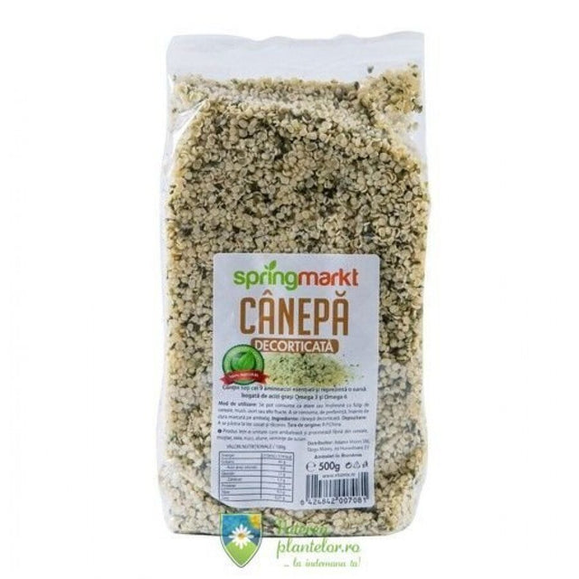 Seminte de Canepa Decorticate (Springmarkt) - contine toti cei 9 aminoacizi esentiali si reprezinta o sursa bogata de acizi grasi Omega 3 si Omega 6. Avand un gust similar cu semintele de pin si de floarea soarelui semintele de canepa pot fi folosite in orice reteta. In ceea ce priveste continutul nutritiv samanta de canepa decorticata contine in principiu 30% proteine 42% grasime si 15% carbohidrati. Pentru diabetici indicele glicemic al semintelor de canepa decorticate este considerat mic datorita continutului scazut de carbohidrati. Semintele sunt de asemenea pline de nutrienti care modereaza nivelul de zahar din sange.
